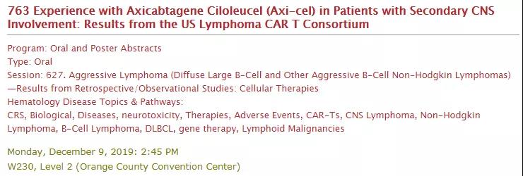 背景:Axicabtagene Ciloleucel(Axi-cel)是一种抗CD19 CAR-T细胞疗法,于2017年10月被批准用于治疗复发/难治性侵袭性B细胞非霍奇金淋巴瘤。基于ZUMA-1的研究FDA批准Axi-cel用于复发难治弥漫大B淋巴瘤的治疗,但ZUMA-1研究未纳入先前存在或活动性的继发中枢神经系统(CNS)淋巴瘤受累的患者(pts)。近期Frigault等人发表了一项关于应用Tisagenlecleucel CAR-T细胞治疗8例继发中枢神经系统受累淋巴瘤患者的报告。鉴于这两种CAR-T细胞疗法神经毒性表现不同,因此进一步明确Axi-cel在继发中枢神经系统淋巴瘤中的疗效尤为重要。在此我们报告17例既往出现继发性中枢神经系统受累患者或在Axi-cel CART输注时合并有中枢神经系统表现的患者接受Axi-cel CART治疗的真实世界经验。