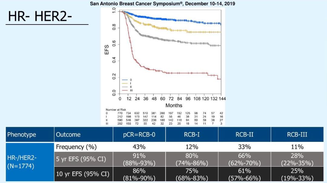 RCB为0级的,也就是乳腺或淋巴结无癌残留的患者显示出非常好的EFS,可达85%,而RCB 3级,即化疗耐受,广泛残留病变的患者EFS低于40%。COX比例风险回归模型显示RCB分级越高预后越差。该回顾性研究还给出了不同分子分型与RCB 的关系:TNBC中RCB为0级5年EFS为91%,RCB 3级仅为28%;HER2型患者中RCB为0级的5年EFS为94%,RCB 3级为60%;激素受体阳性、HER2阳性的三阳性乳腺癌患者RCB 0级5年EFS为94%,RCB 3级为54%;luminal型患者RCB 0级5年EFS为88%,RCB 3级为71%。可以看出RCB预测模型在不同分子亚型患者当中都是比较好的预测因子,尤其是TNBC及HER2型患者当中,RCB模型的应用会对后续治疗有很大的指导意义。