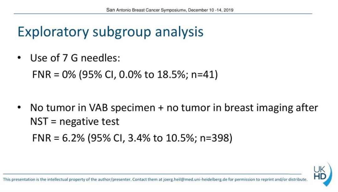 张东伟教授:随着系统治疗效果的极大提升,有学者提出设想,对于新辅助治疗达到pCR的患者或许可以进一步豁免手术,前提是需要得到一种精确的pCR评估方法。目前除了手术以外,尚无其他检查手段能够准确的评估pCR。这项来自德国海德堡的研究(摘要号:GS5-03)目的是想通过影像学引导下活检来判断是否达到完全缓解。患者通过新辅助治疗后影像学检查提示达到CR或PR的患者,应用真空辅助微创活检(VAB)进行评估,所有患者都进行手术治疗并对病灶行术后病理的检测。研究共入组398例患者,主要研究终点是检测残余肿瘤病灶的假阴性率(false negative rate,FNR)。