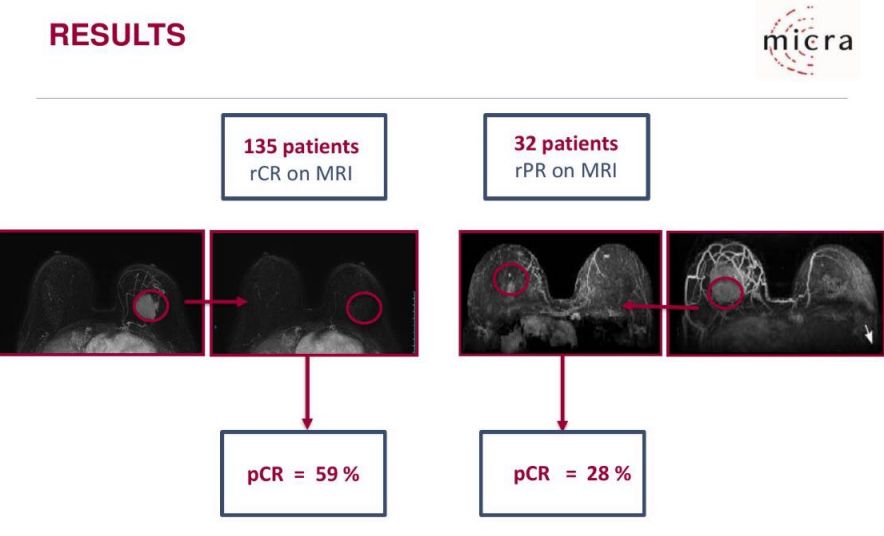 郭宝良教授:这项研究FNR虽然很低,但确实有样本量较小的因素。同时本次会还有二项报道的相关议题,一项Ⅱ期临床研究(NRG BR 005)也没有达到理想的阴性预测值,另外一项来自荷兰的MICRA研究同样是应用MRI、钼靶或超声引导的空芯针活检对残留病灶进行评估,FNR为37%,也没有取得理想的结果。这个研究中值得借鉴的是,通过MRI看到残存病灶的32例患者中,有28%的患者在术后证实其实是达到pCR的。这说明影像学的阳性预测结果也并不一定非常准确,最终还是需要通过病理学检测来判断。
