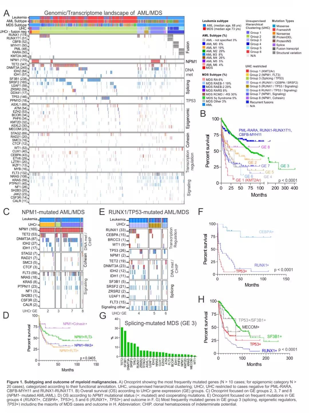 研究背景:近年来,基因组测序的研究提高了我们对于髓系肿瘤(包括AML及MDS)发病机制的理解,也进一步完善了特定亚组的分类。但是,既往的研究主要是分析特定亚型和(或)使用靶向DNA测序,因此限制了我们对于新突变模式和基因表达簇的发现。该研究通过对成人AML和MDS患者进行检测,通过全基因组突变/转录组学整合分析以准确鉴别亚型、评估预后和指导治疗。