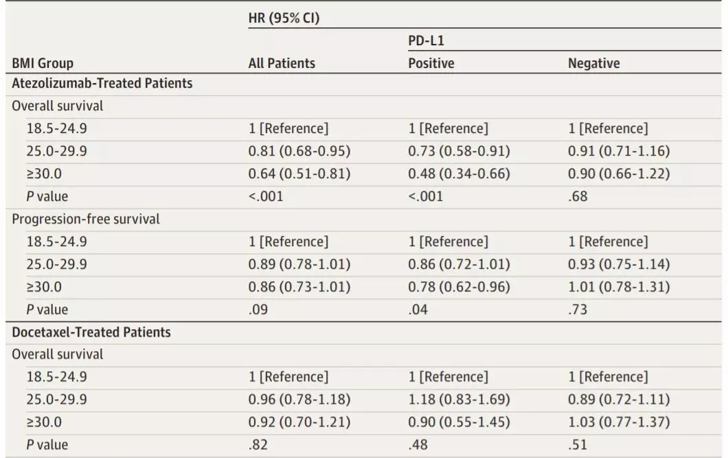 Take home message:高BMI似乎与非小细胞肺癌患者使用阿替利珠单抗改善生存独立相关,在未来的免疫检查点抑制剂治疗试验中,可将基线BMI视为分层因素。