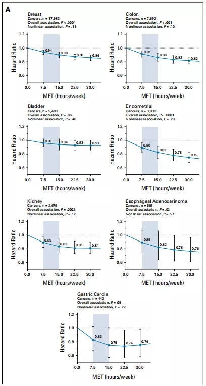 该研究共755,459名参与者(中位年龄62岁[范围32-91岁],其中53%为女性),经过10.1年随访共有50620例癌症病例出现。其中,参与推荐量的活动(7.5~15 MET小时/周)与研究的15种癌症中的7种风险降低有较强的统计学关系,包括结肠癌(男性风险降低8~14%),乳腺癌(风险降低6%~10%),子宫内膜癌(风险降低10%~18%),肾癌(风险降低11%~17%),多发性骨髓瘤(风险降低14%~19%),肝癌(风险降低18%~27%),非霍奇金淋巴瘤(女性风险降低11%~18%)。剂量-反应关系曲线一半呈线性,另一半呈非线性。中等强度和高强度体育活动的结果是混合的。体重指数的调整消除了与子宫内膜癌的联系,但对其他类型的癌症的影响是有限。