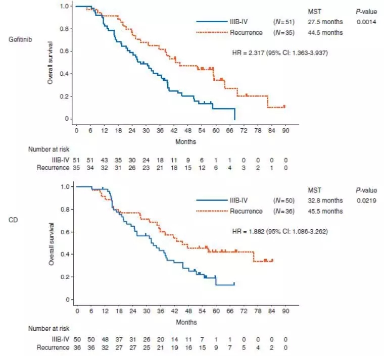 对于携带19del或21L858R突变的晚期或复发性NSCLC患者而言,一线吉非替尼或者化疗并不能改善患者的OS,术后复发的患者较非术后复发的患者有更好的预后。