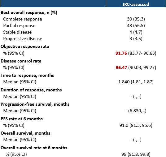截至数据截止日,其中73例受试者仍在治疗中。纳入的85例受试者均接受了疗效评价, 经独立影像审查委员会(IRC)根据Lugano2014标准评估,78例达到了客观缓解,ORR高达91.76%, CR率为35.3%,6个月PFS率为91%(最终数据以国家药品审评中心的评审结果为准)。