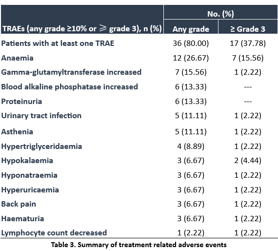 治疗期间,77例(90.6%)患者发生了不同级别的治疗相关不良反应(TRAEs),大部分为1-2级TEAE。最常见的TRAE为发热(26/85, 30.6%)、中性粒细胞计数降低 (16/85, 18.82%)和白细胞计数降低 (15/85, 17.65%)。23例(27.06%)发生了3级及3级以上的TRAE,其中肝功能异常(5/85, 5.88%)和高尿酸血症最为常见(4/85, 4.71%)。