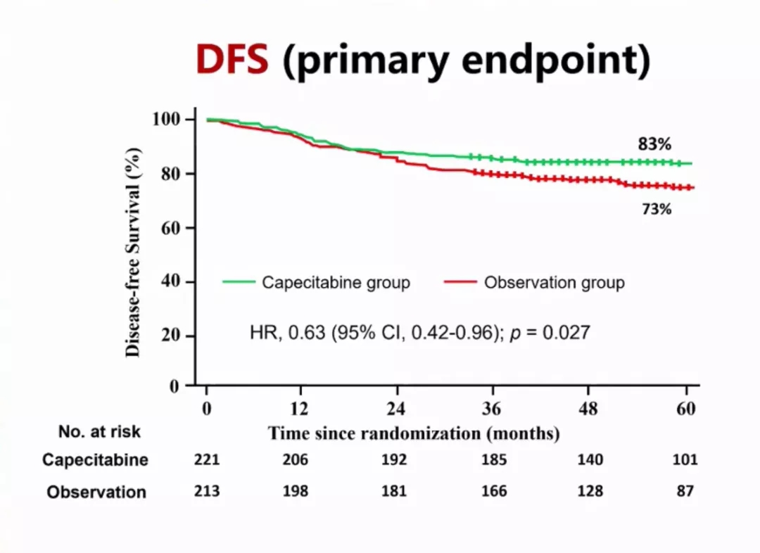 SYSUCC-001入组标准要点包括两个:(1)三阴;(2)浸润性导管癌。干预措施分为卡培他滨节拍化疗组和观察组,卡培他滨用量650 mg/m2 bid治疗1年,在主要终点5年DFS方面,节拍化疗体现出10%的绝对获益(83% vs. 73%,HR 0.63,95%CI:0.42~0.96,P=0.027),复发风险降低37%(图1)。卡培他滨节拍化疗降低复发主要源于降低肺脏、骨骼等远处转移。安全性方面,卡培他滨组3级及以上手足综合征发生率为7.7%,其他3级及以上AE发生率均为0%。