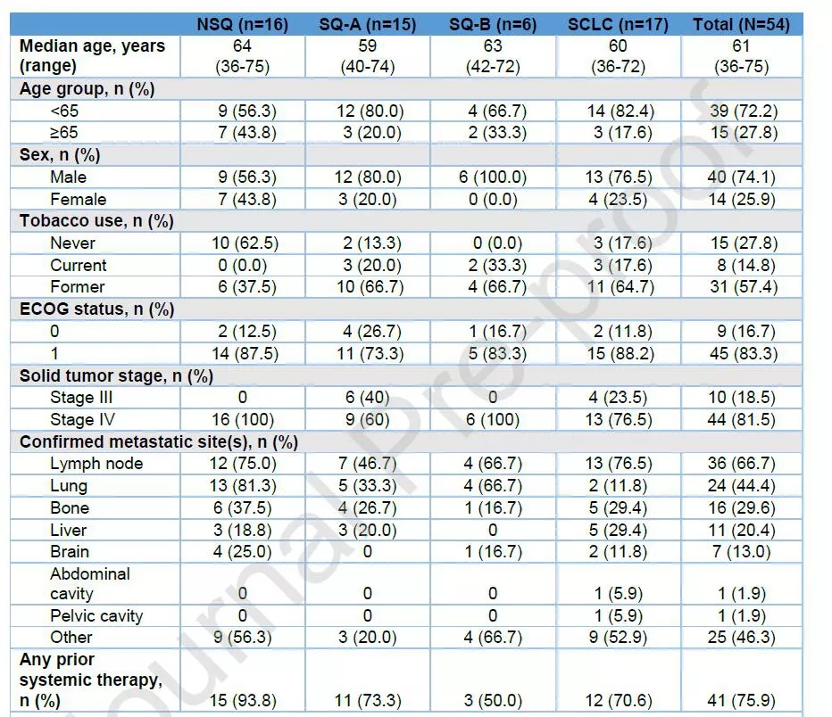 本研究共入组54例患者,队列1、队列2、队列3和队列4分别入组16例、15例、6例和17例患者,全组患者中位年龄61岁,均为EGFR/ALK野生型患者,81.5%的患者出现远处转移,包括淋巴转移(66.7%)、肺转移(44.4%)、骨转移(29.6%)和肝转移(20.4%)(图1)。