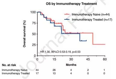 未接受及接受免疫治疗的患者,中位OS分别为37.7个月和49.3个月,HR=1.30,P=0.53(图3)。