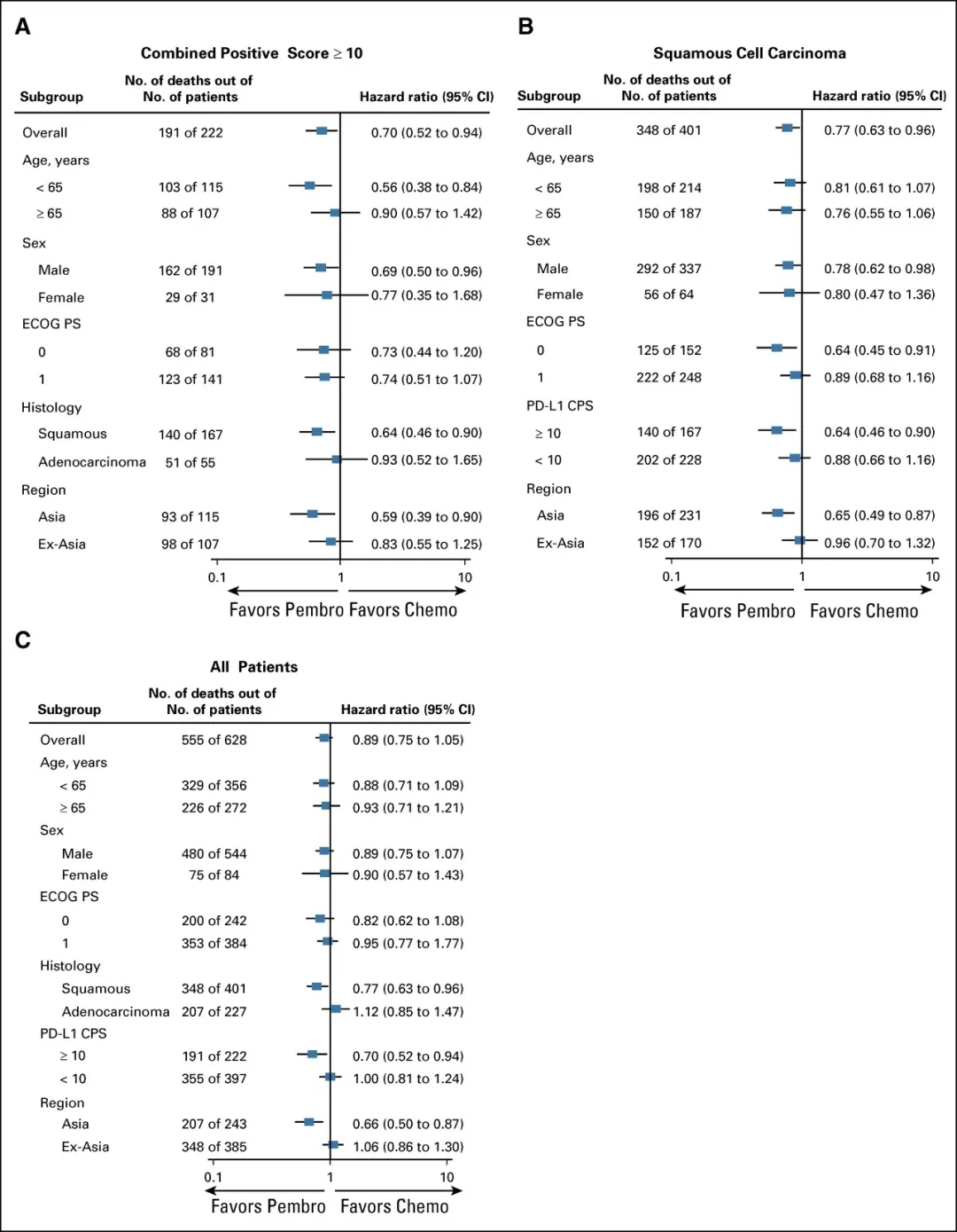 在CPS≥10的关键预设定亚组患者中,派姆单抗与化疗的生存结局通常相似,在鳞状细胞癌患者和亚洲患者中观察到最大的生存收益(图2)。
