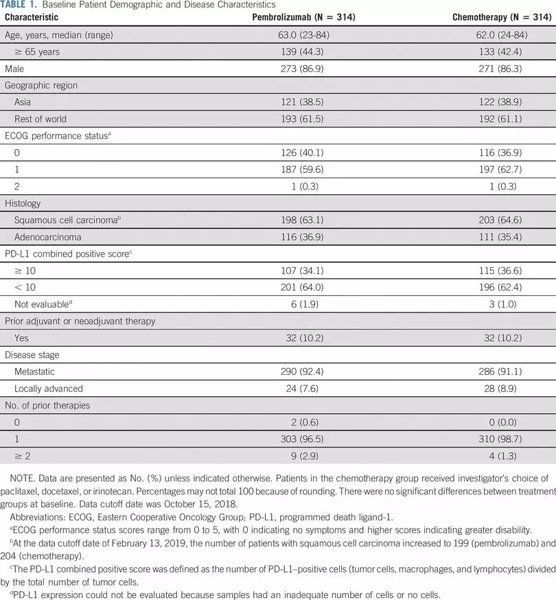 KEYNOTE-181研究是一项国际性多中心、开放标签、随机对照Ⅲ期临床研究。研究纳入628例一线治疗后进展的晚期/转移性鳞状细胞癌或腺癌的食管癌患者(表1),以1:1随机分配接受派姆单抗治疗(200 mg/3周,治疗2年)或化疗(根据研究者选择紫杉醇、多西他赛或伊立替康)。主要终点为PD-L1联合阳性评分(CPS)≥10的患者中以及所有患者的总生存(OS)。
