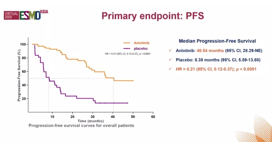 研究结果达到了主要研究终点,即安罗替尼组的平均PFS为40.54个月(95%CI:28.29~NE),安慰剂组为8.38个月(95%CI:5.59~13.80)(P<0.0001)。HR为0.21(95%CI:0.12~0.37)(图3,图4)。