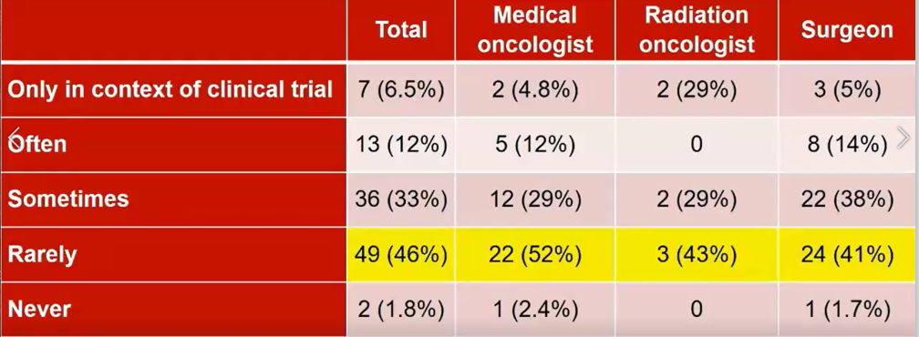 绝经前患者首选治疗方案是他莫昔芬,绝经后患者首选是芳香化酶抑制剂。大多数被调查的医生计划在手术前尽可能短的时间内使用新辅助内分泌治疗。当按专业分层时,更多的MO表示,他们会根据病人肿瘤进展的风险改变治疗时间。大多数医生建议在新辅助内分泌治疗1、2或3个月后豁免腋窝淋巴结清扫(1个月N=56/93,60%;2个月N=54/92,59%;3月N=48/90,53%)。随着治疗时间的延长,豁免腋窝淋巴结清扫的倾向下降(6个月后绝对豁免N=25/ 91,27%;6个月后可能豁免N=38/ 91,42%;1年后绝对豁免N=26/92,28%;1年后可能豁免N=29/92,32%)。豁免腋窝淋巴结清扫与被调查医生的执业年限、执业时间、执业类型或环境、参与多学科肿瘤委员会的情况、执业状态下COVID-19病例数无关。