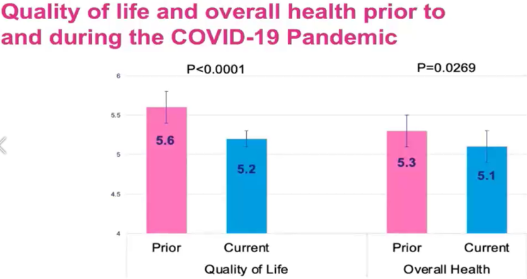 总体而言,报告的QOL在大流行前平均(SD)5.5分(1 分为非常差,7分为优秀),大流行结束时的平均(SD)为5.1分( 2020年3月1日至6月30日);P<0.0001。53例(26%)患者报告大流行前生活质量良好,大流行期后降至32例 (16%);P<0.0001。在大流行之前,总体健康状况的平均(SD)为5.3分,到大流行结束时为5.1 分;P=0.0368。