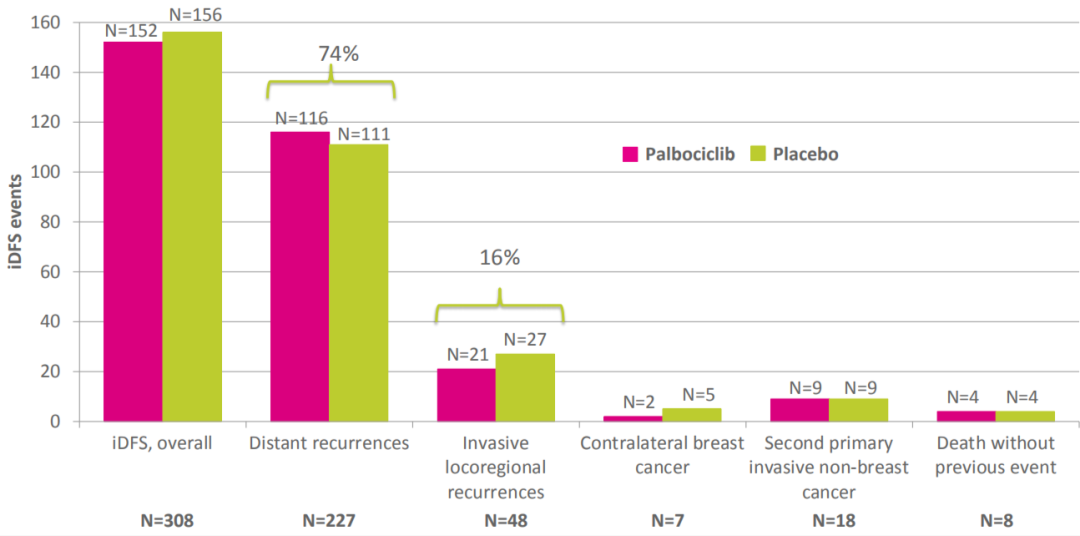 在2014年2月至2017年12月期间,共有1250例患者被随机分组(palbociclib组631例,安慰剂组619例)。患者的中位年龄为49.7岁(范围19-79岁),乳房有残存病灶的占96.8%,ypN+占94.6%,G3占47.4%,Ki67>15%占27.7%,CPS-EG评分≥3的患者为54.7%。1118名患者(89%)完成了至少7个周期的治疗。50.1%的患者接受了芳香化酶抑制剂(AI),49.8%的患者接受了他莫昔芬,6.6%的患者接受了AI+促性腺激素释放激素(GnRH)和9.7%的患者接受了的他莫昔芬+GnRH。最常见的相关严重不良事件(SAEs)是感染和血管疾病,其中报告了8例致命相关严重不良事件。