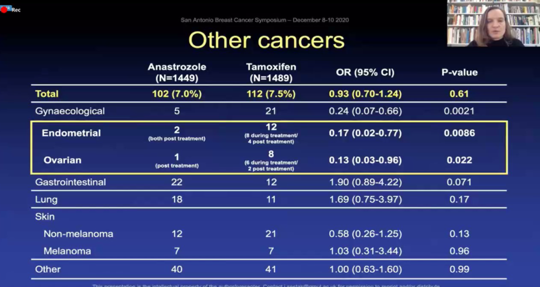 经过将近12年的随访,同样也看到了在一些其他特征上的差别,如非乳腺癌的肿瘤发生,包括子宫内膜癌、卵巢癌等,阿那曲唑组更少。但是阿那曲唑组的骨折发生率和短暂性脑缺血发作(TIA)/卒中却更高。