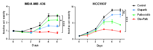 图5.单独或联合使用PARPi或CDK4/6i下细胞增殖曲线。