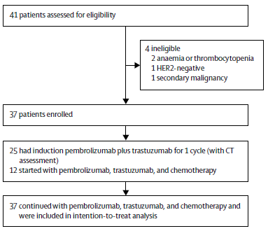 编者按:HER2阳性晚期胃癌患者预后较差,抗HER2联合化疗为一线标准治疗方案,但当前患者的治疗选择有限。Pembrolizumab(帕博利珠单抗)在进展期胃或胃食管交界腺癌患者中,作为单药治疗、联合化疗,显示出了良好的抗肿瘤活性。因此,曲妥珠单抗联合帕博利珠单抗和化疗可能为晚期HER2阳性胃癌患者带来更大益处。本文中,天津医科大学总医院秦琼博士将为我们介绍一项曲妥珠单抗联合帕博利珠单抗和化疗治疗晚期HER2阳性食管胃癌的小样本单臂、II期研究。