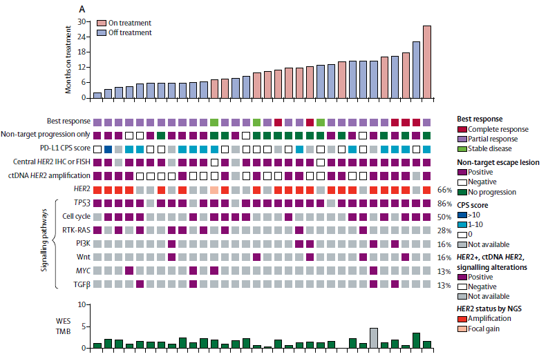 在35例有靶病灶可评估疗效患者中,DCR为100%,ORR为91%(CR 17%+ PR 74%),所有肿瘤均缩小(-20%到-100%),中位起效时间2个月(图3)。其中25例患者第一周期单纯曲妥珠单抗联合帕博利珠单抗治疗,在治疗3周后评估,2例达到PR,12例有不同程度肿瘤缩小;在联合化疗前后有配对的cfDNA患者中,81%(13/16)经过首轮曲妥珠联合帕博利珠单抗治疗后ctDNA含量下降,其中10例患者PFS均超过6个月,9例患者达到ctDNA清除。和12例首周期联合化疗患者相比,两组mPFS分别13个月和14.6个月,1年OS率分别为91%和75%,均无统计学差异。在不良反应方面,3度及以上发生率49%,SAE 5%,因AE导致治疗中断5%。在免疫相关不良反应方面,最常见的是淋巴细胞减少(24%),3度以上免疫相关性肾炎(5%)和转氨酶升高(3%)。