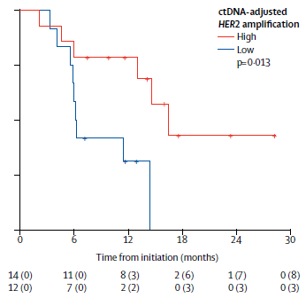 3、对于ctDNA来评估HER2状态,这项研究也给了很好的启示。不仅血浆ctDNA能反映肿瘤组织HER2的状态一致性高达93%,更重要的是血浆ctDNA HER2高低和治疗后PFS相关,我们能通过血浆HER2是否清除,更好的预测疗效。