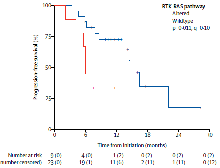 在该研究中,似乎ctDNA的扩增情况和疗效相关,RTK-RAS通路野生型患者PFS更长。(图5)
