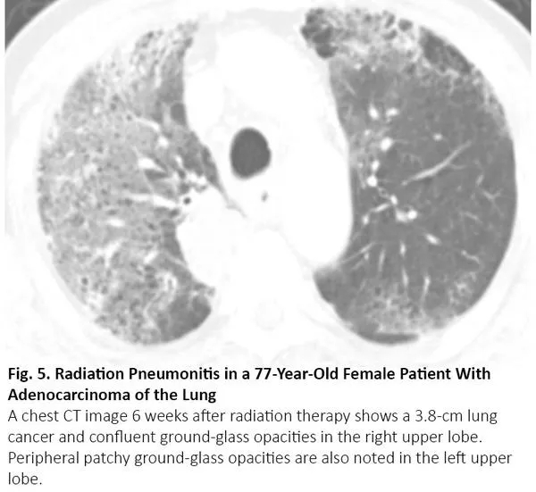 图5. 一位77岁肺腺癌女性患者出现放射性肺炎