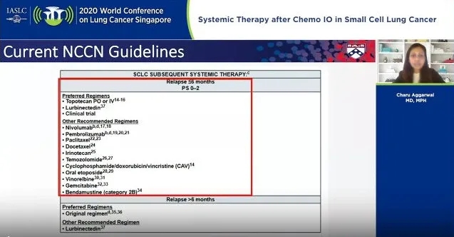 美国宾夕法尼亚大学Charu Aggarwal介绍了SCLC免疫化疗后的系统治疗最新进展。免疫疗法+化疗已经被获批用于广泛期小细胞肺癌(ES-SCLC)一线治疗。二线治疗选择化疗方案时,考虑疾病对化疗的敏感性也很重要,临床医生必须考虑哪些患者从化疗中获益最大,何时使用以及使用哪种药物。
