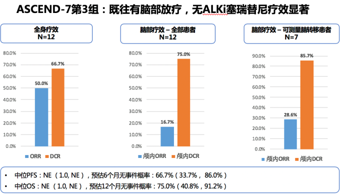 ASCEND-7研究第1组为既往有脑部放疗,经ALK抑制剂治疗的患者,塞瑞替尼治疗后全身ORR达35.7%,颅内ORR为26.2%,颅内DCR为71.4%,可测量脑转移患者颅内ORR为39.3%。