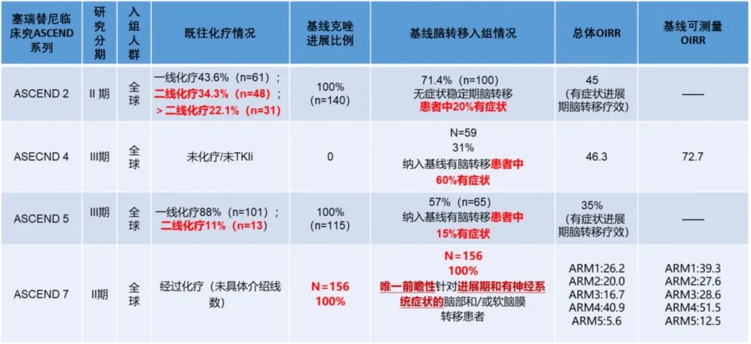 图1. ASCEND系列研究中脑转移及脑膜转移入组比例及疗效