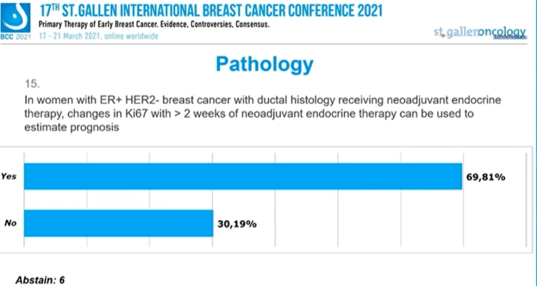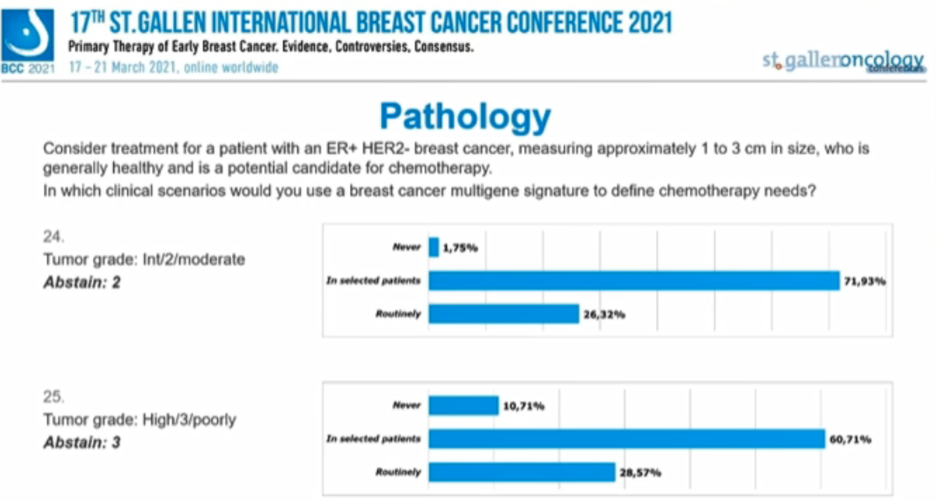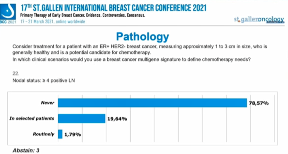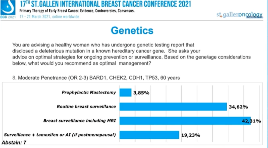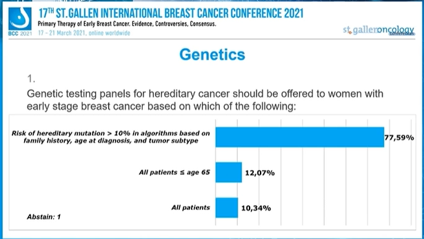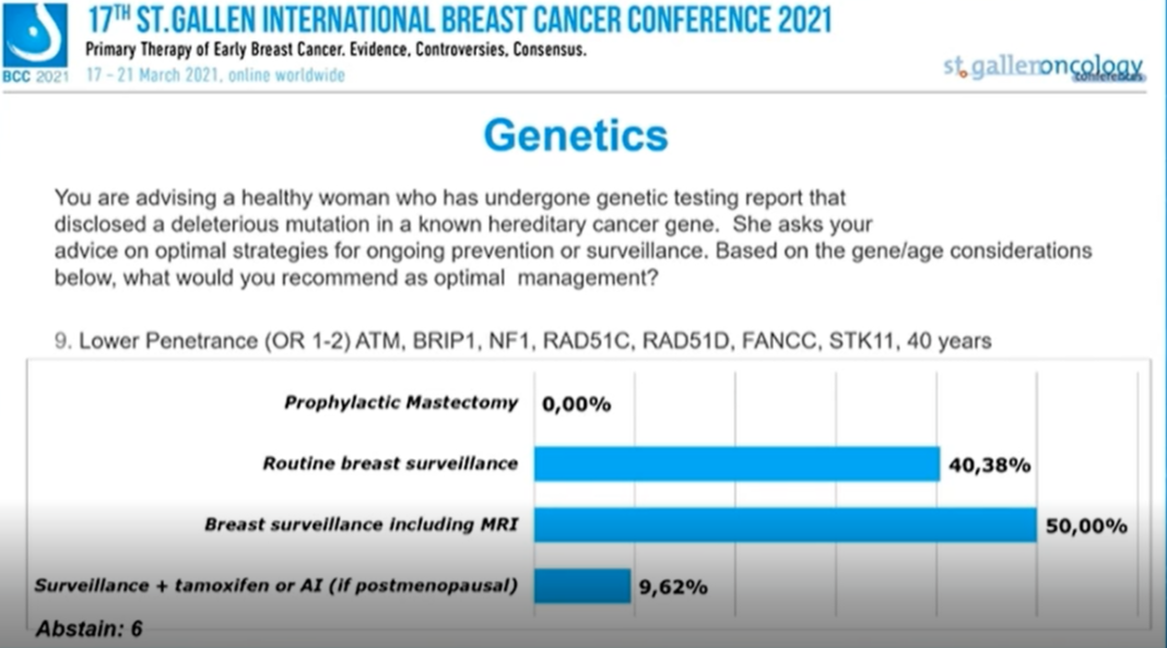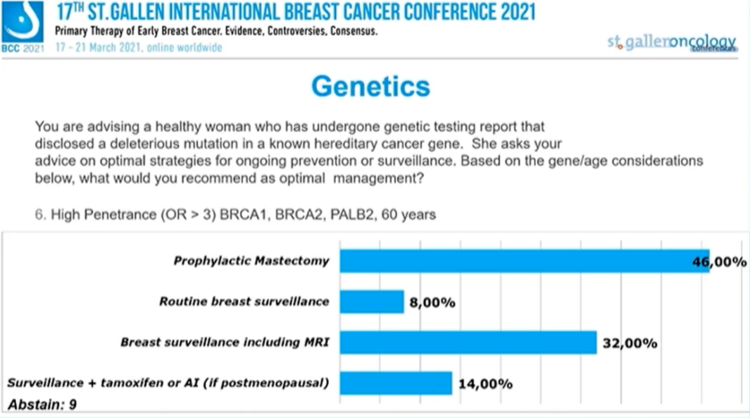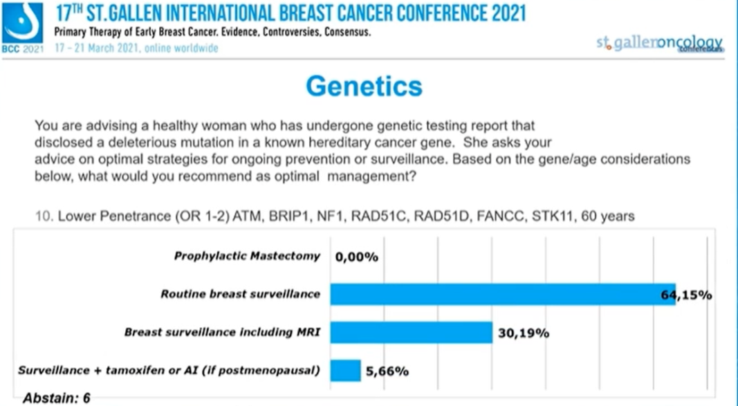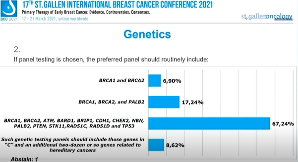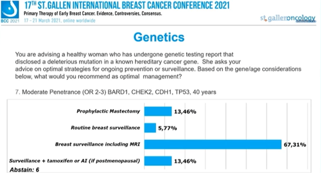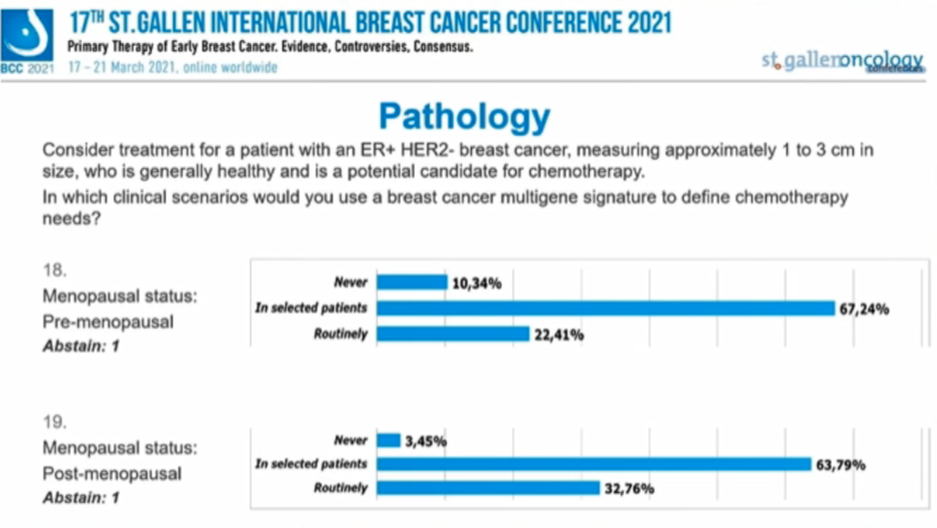 编者按:当地时间3月20日,在Eric Winner教授的主持下,第十七届圣加伦国际乳腺癌大会(SG-BCC 2021)的专家完场了首场投票,本文总结“基因检测、病理及影像”部分的专家投票结果。