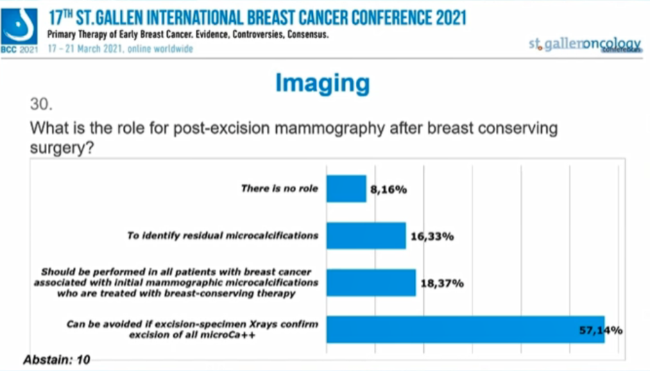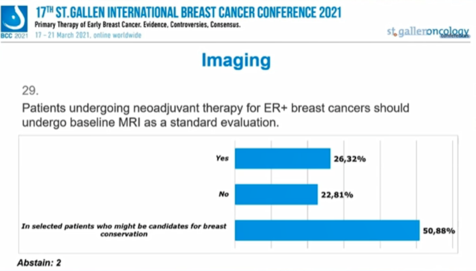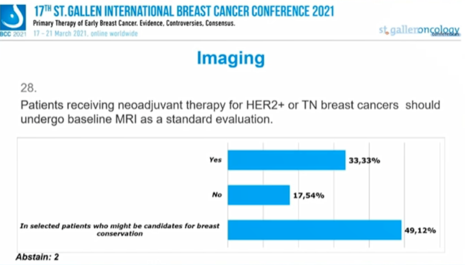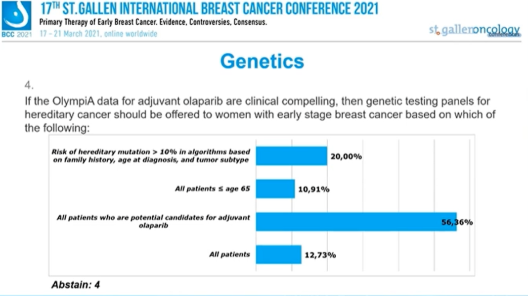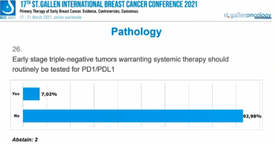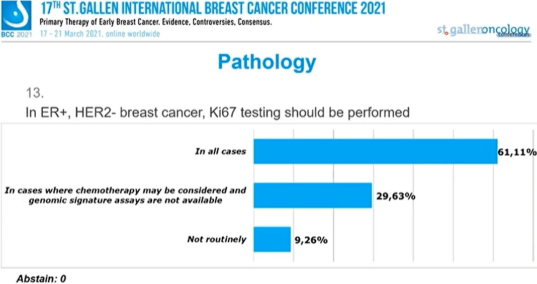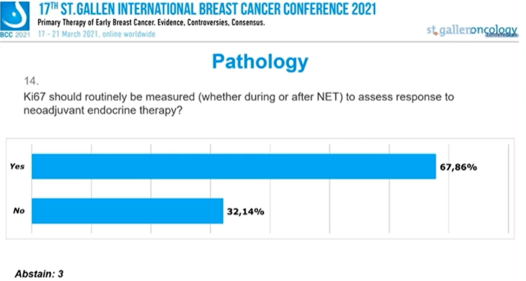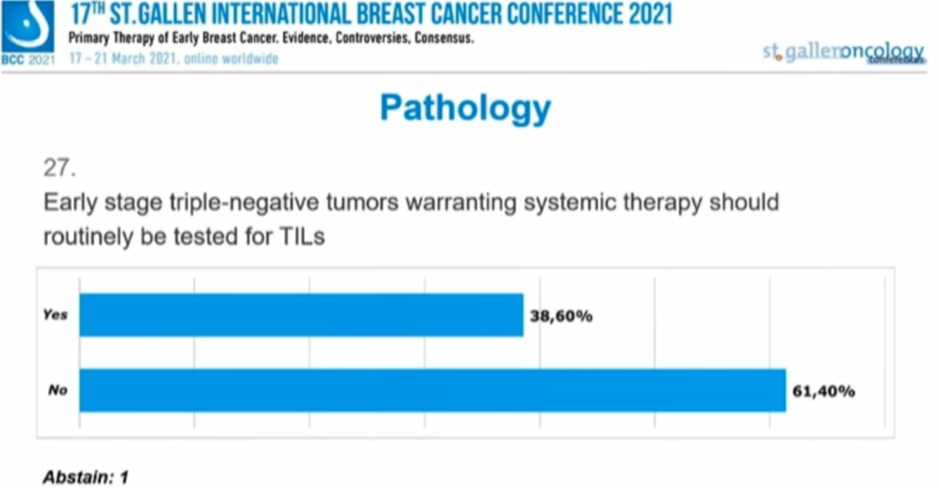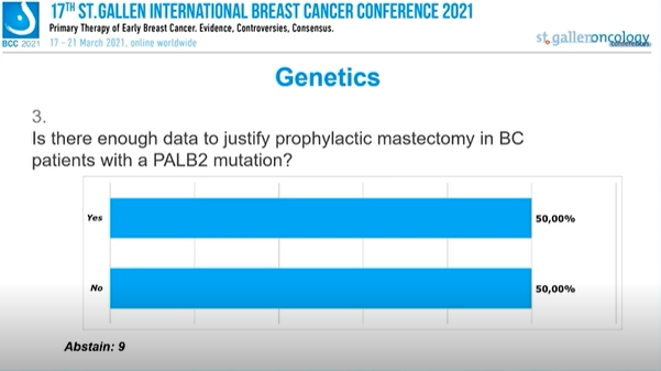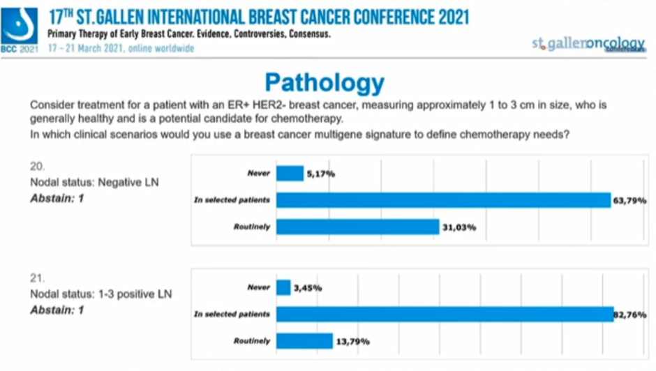 编者按:当地时间3月20日,在Eric Winner教授的主持下,第十七届圣加伦国际乳腺癌大会(SG-BCC 2021)的专家完场了首场投票,本文总结“基因检测、病理及影像”部分的专家投票结果。