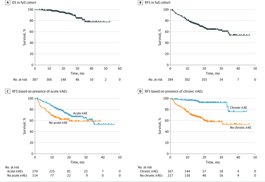 停止治疗原因为:治疗完成(n=193;50.0%)、irAEs(n=98;25.3%)和疾病进展(n=81;20.9%)。大多数患者无疾病复发(n=268;69.3%);69例(17.8%)和50例(12.9%)患者分别出现疾病转移和局部复发。中位总生存率和RFS未达到,359例(93.0%)患者在中位随访529天(幸存者为530天)时存活(图A和B)。急性或慢性irAEs患者的RFS优于无irAEs患者。