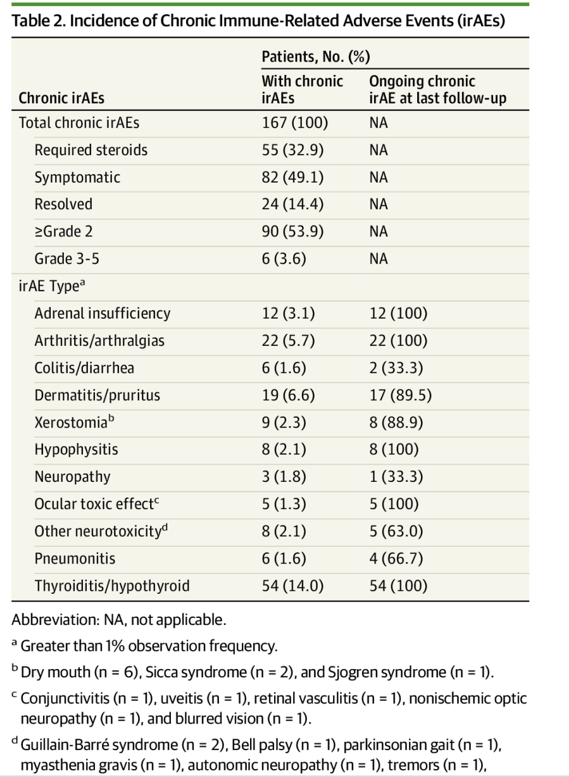 在这项多中心队列研究中,与抗PD-1治疗相关的慢性irAEs似乎比以前认识到的更常见,即使在长期随访中也经常持续存在,尽管大多数是低级别的,慢性irAEs的风险应纳入治疗决策中。