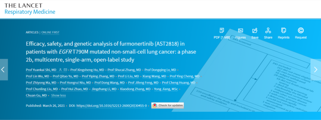 1、Yuankai Shi,Xingsheng Hu,Shucai Zhang, et al. Efficacy, safety, and genetic analysis of furmonertinib (AST2818) in patients with EGFR T790M mutated non-small-cell lung cancer: a phase Ⅱb, multicentre, single-arm, open-label study. Lancet Respir Med. Published on March 26, 2021. DOI: https://doi.org/10.1016/S2213-2600(20)30455-0