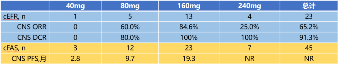 缩写:CNS, 中枢神经系统;cEFR,CNS可评估疗效集;cFAS,CNS全分析集;ORR,客观缓解率;DCR,疾病控制率;PFS,无进展生存期 ; NR , 未达到