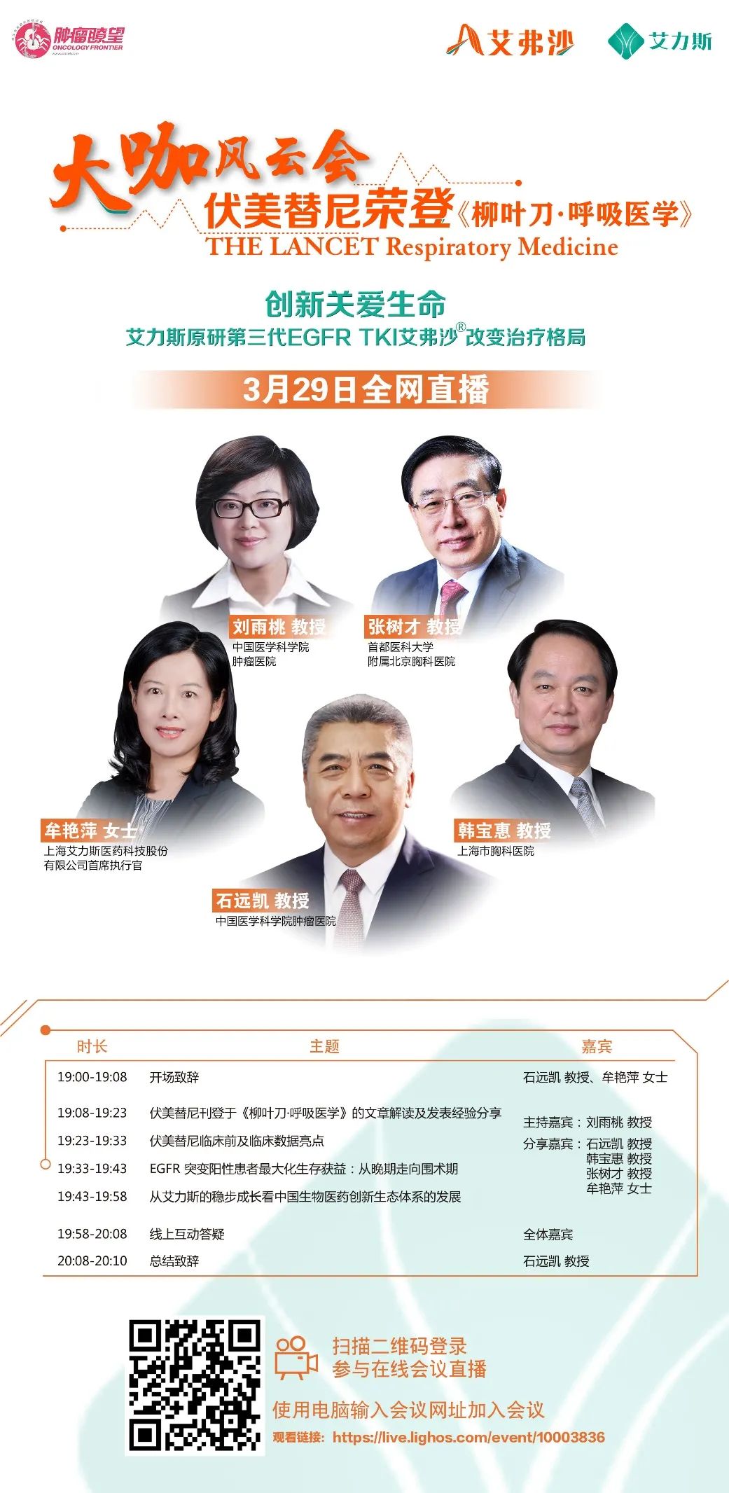 随着伏美替尼上市并荣登《柳叶刀·呼吸医学》,国内EGFR突变阳性NSCLC的靶向治疗选择将再次迎来新的改变,万众瞩目中,新的EGFR-TKI用药格局将会有怎样的变化?此次伏美替尼Ⅱb期研究的PI怎样看待其带来的进展?EGFR-TKI未来的研发方向又将何去何从?中国未来的新药自主创新之路将去往何方?3月29日(周一)晚19:00,“伏美替尼荣登《柳叶刀·呼吸医学》大咖风云会”隆重举行!研究总PI、肺癌领域专家及药企CEO共议中国创新药企的飞速发展,见证肺癌治疗格局的迭代变更!