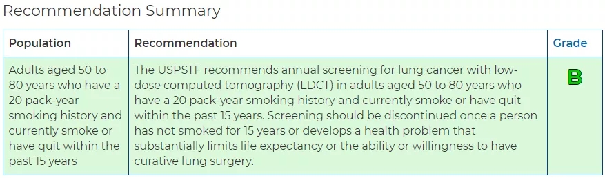 之前的指南只建议55岁及以上且有30包/年吸烟史的人进行LDCT肺癌筛查。