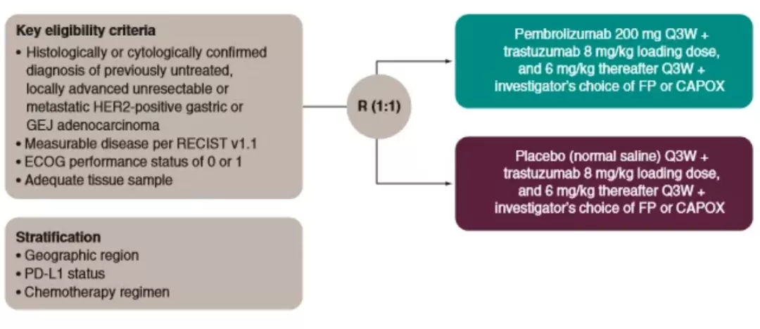 该批准是基于正在进行中的多中心、随机、双盲、安慰剂对照试验——KEYNOTE-811(NCT03615326)试验的中期分析结果。KEYNOTE-811研究纳入既往未接受过系统治疗的晚期不可切除或转移性HER2阳性胃癌/食管胃交界部腺癌患者。患者以1:1的比例随机分配接受每3周帕博利珠单抗200 mg或安慰剂治疗,并联合曲妥珠单抗和氟尿嘧啶加顺铂或者联合卡培他滨加奥沙利铂。(图1)