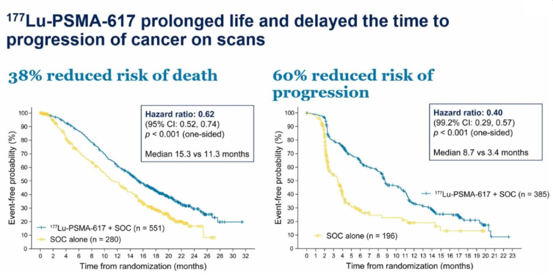 该研究入组了831例PSMA阳性(阈值大于肝脏背景)的mCRPC患者,按2:1的比例随机分配至单独标准治疗(SOC,n=280)或177Lu-PSMA-617+SOC(n=551)。值得注意的是,SOC方案并不包括化疗、Ra-223方案,毒副作用更小,疗效也可能削弱。