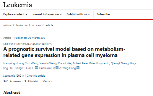 5.  Huang HY, Wang Y, Wang WD, Wei XL, Gale RP, Li JY, Zhang QY, Shu LL, Li L, Li J, Lin HX, Liang Y. A prognostic survival model based on metabolism-related gene expression in plasma cell myeloma. Leukemia. 2021 Mar 8. doi: 10.1038/s41375-021-01206-4. Epub ahead of print. PMID: 33686197.