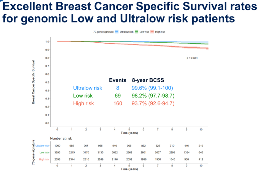 研究结论:根据本次ASCO会议中公布的研究结果显示,通过70-gene检测识别出的超低风险患者,似乎具备这样的惰性特征:肿瘤<2cm,淋巴结阴性,组织学分级为1或2级,ER阳性。该项前瞻性研究中,无论临床风险状况如何,超低风险70-gene特征的患者预后良好,8年BCSS≥99%,8年DMFI为95%~98%。