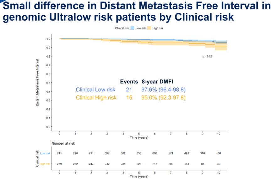 本次ASCO会议中公布了针对MINDACT研究当中1000例(15%)具有70-gene超低风险特征患者进行探索性分析结果。根据70-gene特征结果分层(high,low,ultralow)评估5年/8年无远处转移间期(DMFI)和BCSS,并对超低风险组通过临床风险进一步分层分析。