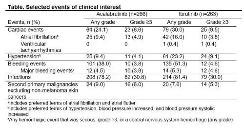 结果显示,中位随访40.9个月(0.0–59.1)时,阿卡替尼非劣效于伊布替尼,两组的PFS均为38.4个月(HR,1.00;95% CI,0.79–1.27)。阿卡替尼组所有级别的房颤发生率显著低于伊布替尼组(9.4% vs 16.0%,P=0.023)。