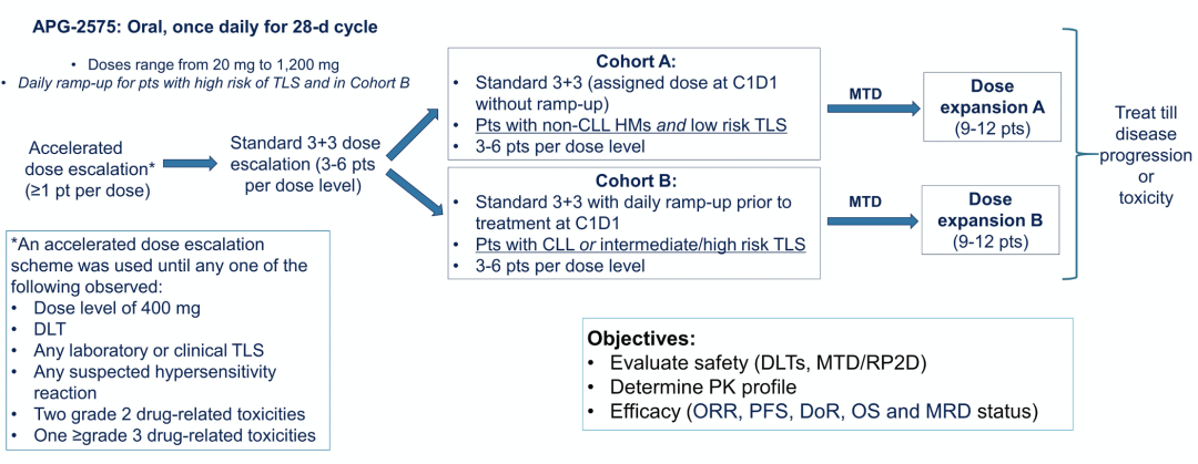 1) 队列A:对于non-CLL/SLL和发生TLS低风险患者,不再经过既往BCL-2i治疗中常用的“Ramp-up”逐步增量方法,直接给予目标剂量。