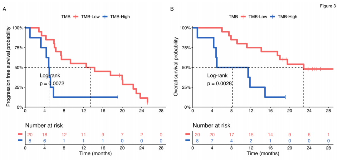也有研究表明,以吡咯替尼为基础治疗高TMB患者与更短的PFS相关;在我们探索性研究的最终分析中,低TMB相较于高TMB患者的PFS(13.44 vs 4.9个月,P=0.0072)和OS(22.87 vs 8.2个月,P=0.0028)有显著延长,高TMB被认为是HER2 + MBC患者OS不良的预后标志物。据我们所知,这一结果首次证明了ctDNA TMB与接受吡咯替尼治疗患者的PFS和OS之间的相关性。TMB可预测和监测治疗反应,作为MBC临床治疗中的探索性生物标志物。