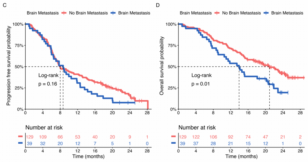 图3. 脑转移人群(蓝线)的PFS和OS