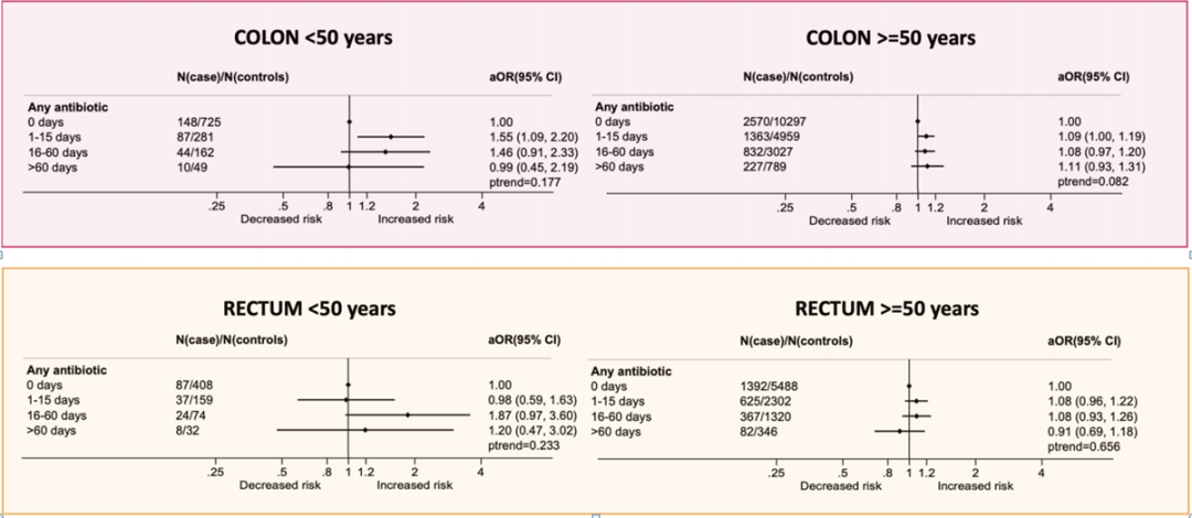 除了50岁及以下患者中非抗厌氧菌抗生素的使用与直肠癌相关(aOR 1.70,P=0.029)外,两组中直肠癌与抗生素使用均无相关性。只有有限的证据表明抗生素使用和结直肠癌风险之间存在阳性暴露-反应关系,但年轻队列中近端结直肠癌除外(趋势P值=0.004)。