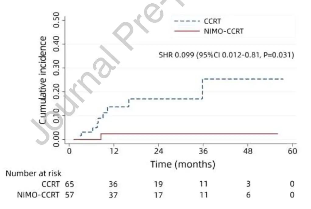 尼妥珠单抗组仅有1.8%的患者出现脑转移,但在单纯同步放化疗组,这一比例为12.3%。多因素竞争风险回归模型显示,联合尼妥珠单抗可显著降低脑转移风险,SHR=0.099,P=0.031。