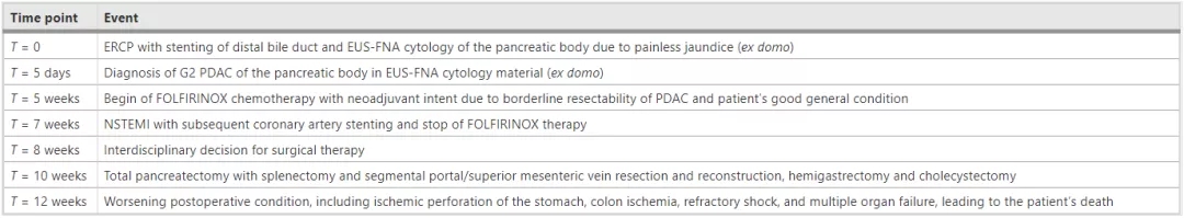 由于ECOG功能状态良好,PDAC的边缘性可切除,患者接受了FOLFIRINOX方案(叶酸、氟尿嘧啶、伊立替康、奥沙利铂)的新辅助化疗,但在第二个FOLFIRINOX周期后,患者出现非ST段抬高型心肌梗死,肿瘤内科医生决定停止化疗并进行手术切除。
