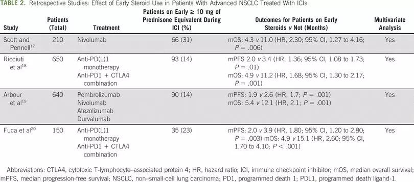 在一项纳武利尤单抗治疗晚期NSCLC患者的研究中,其中近1/3患者同时接受了剂量>10 mg泼尼松等类固醇。使用类固醇的患者的中位OS为4.3个月,不使用(或ICI治疗期间的前30天)类固醇患者的中位OS为 11个月。其他研究报告显示,与接受<10 mg泼尼松治疗癌症无关病症的患者相比,接受≥10 mg泼尼松治疗癌症相关问题的患者的中位PFS和OS更差。“当用于癌症相关病症时,皮质类固醇的使用与较差的预后有关,”《JCO肿瘤学实践杂志》评审作者认为。